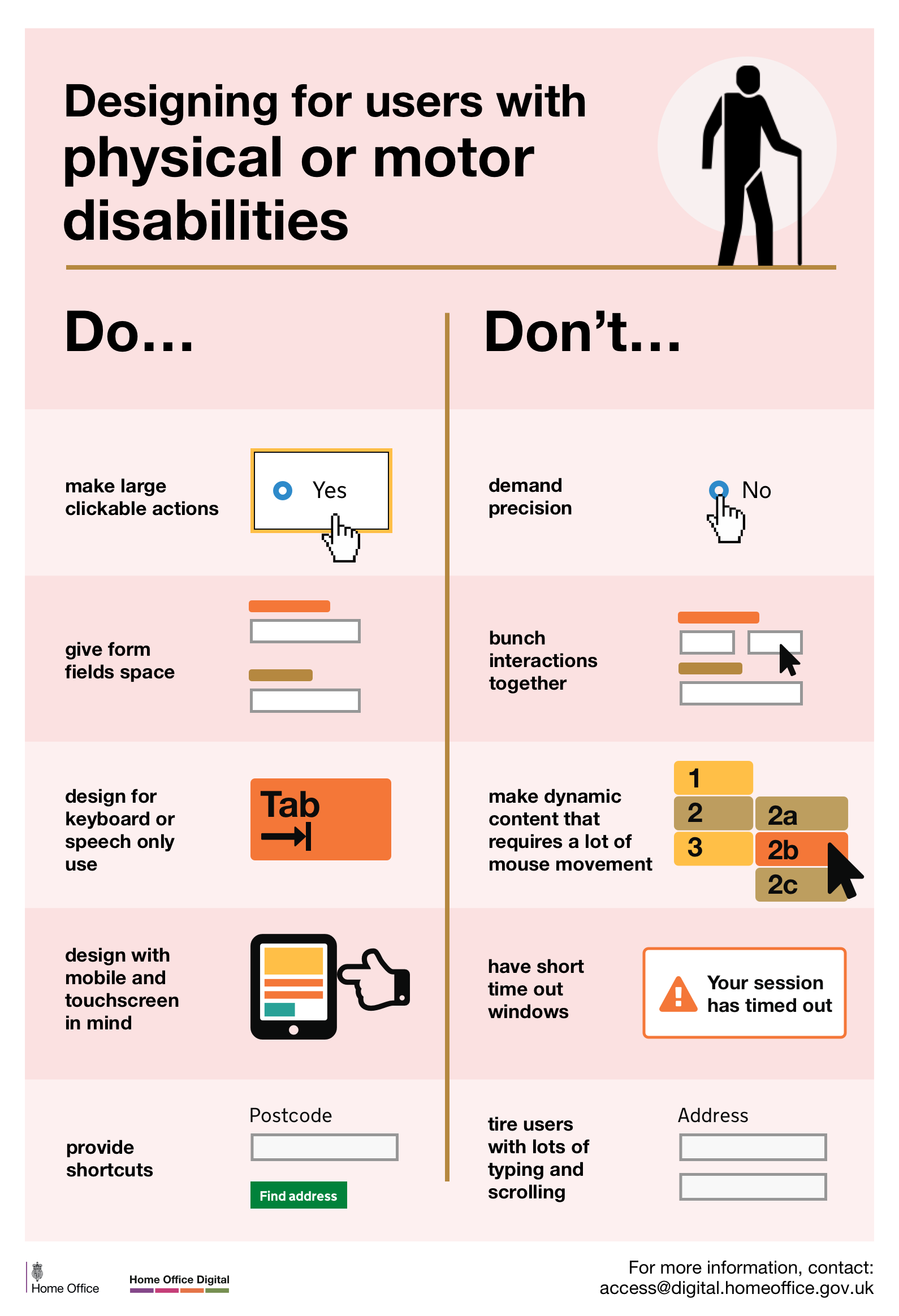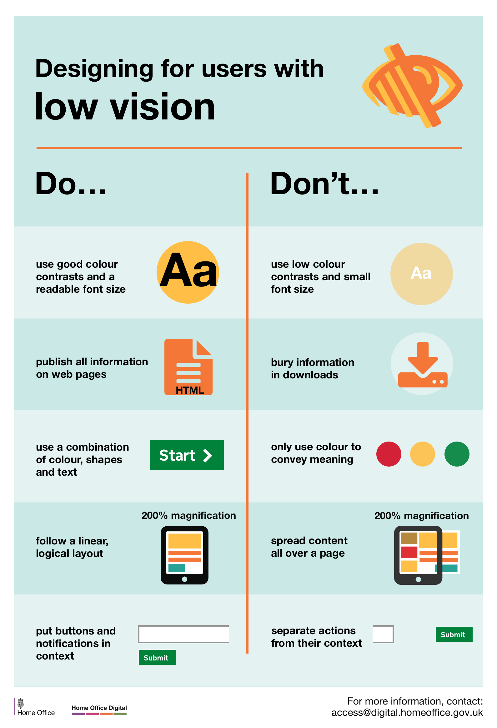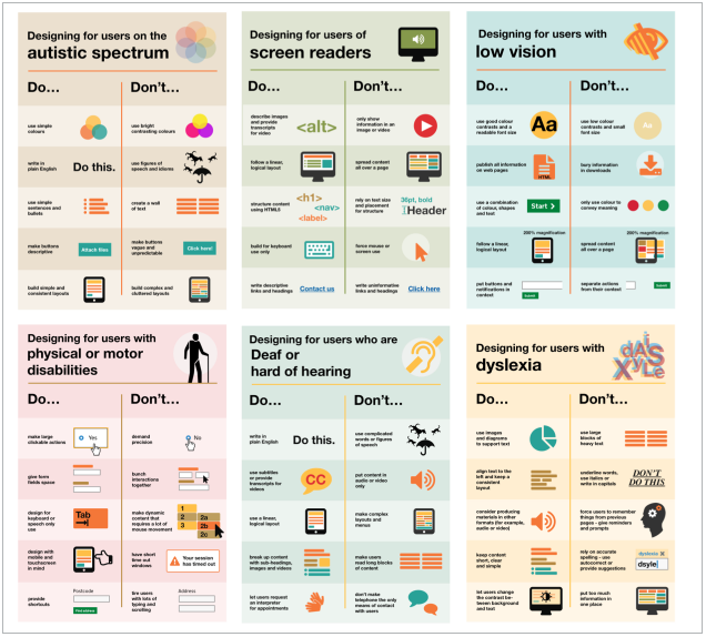 The dos and don’ts of designing for accessibility are general guidelines, best design practices for making services accessible in government.