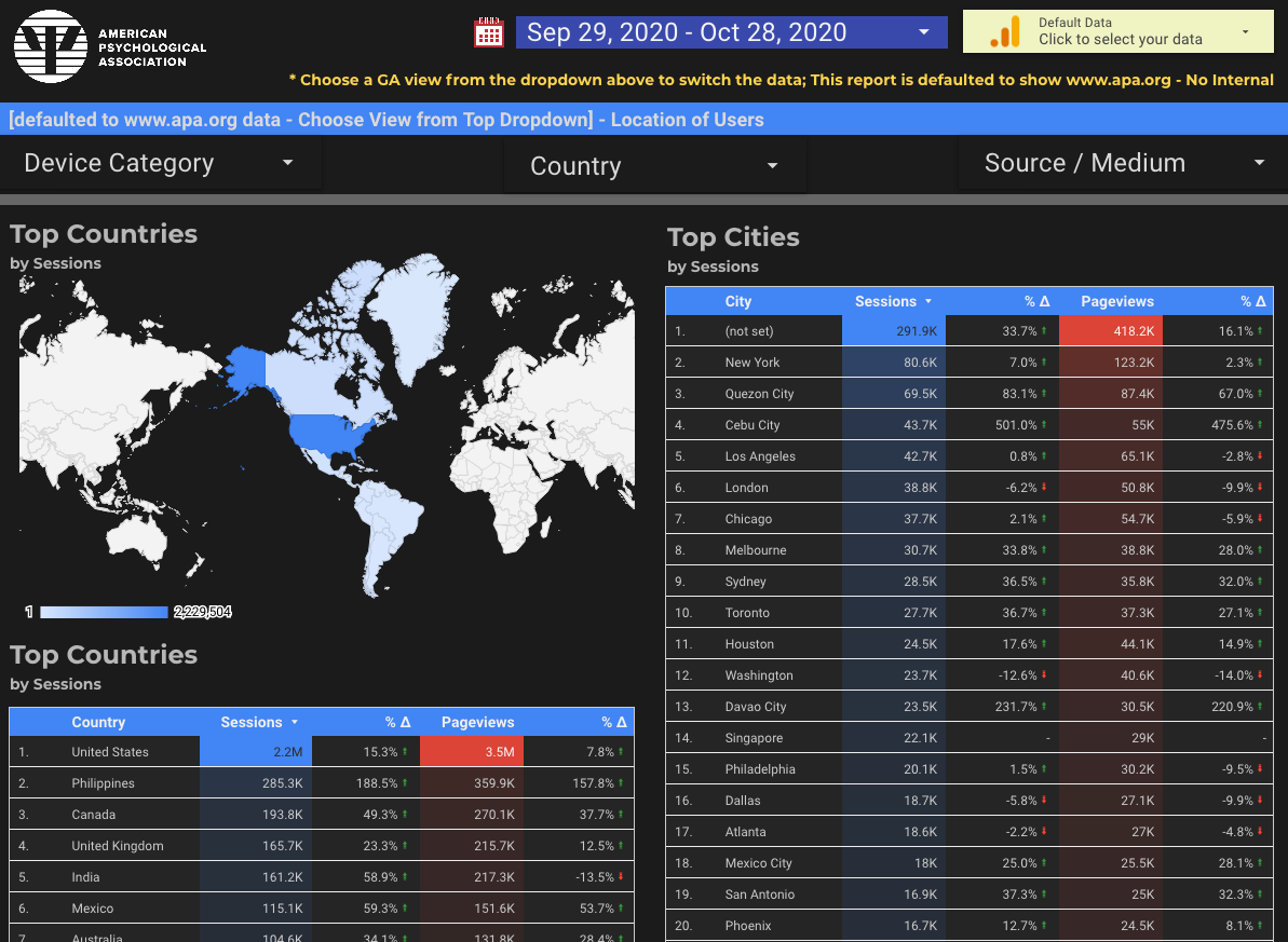 - Google Analytics is the data source for the Location of Users Data Studio report, and the default GA view is the "~0001 www.apa.org - No Internal" view. You can search for and select a different data source by clicking on the top-right dropdown.
