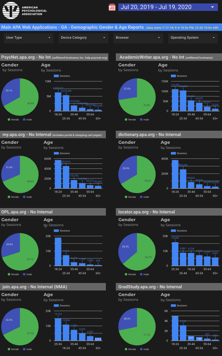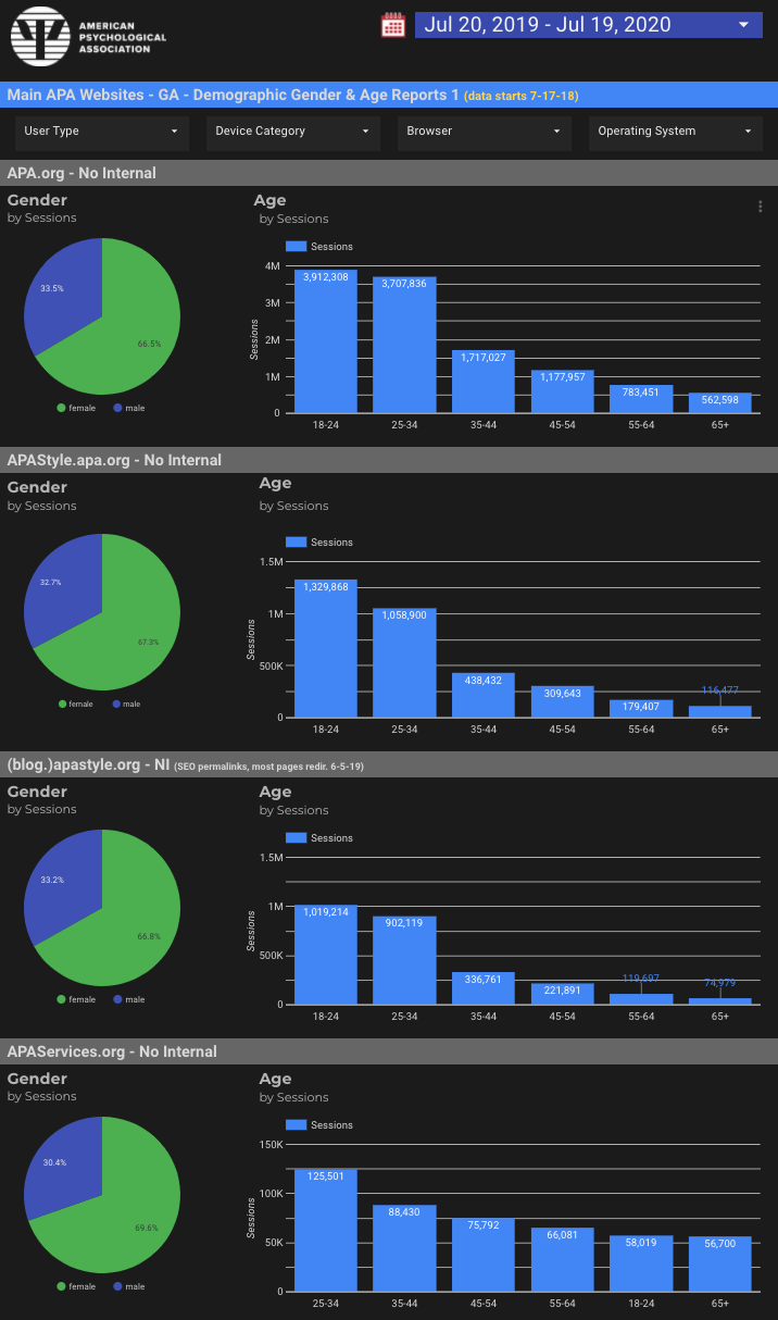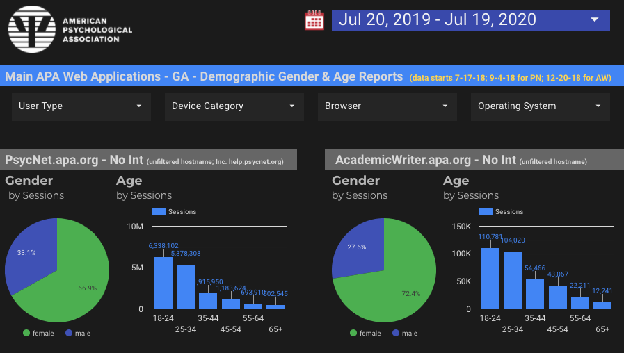 After changes to APA's Privacy Policy a couple of years ago, we started enabling the Demographic and Interests reports in Google Analytics for our websites and web applications.