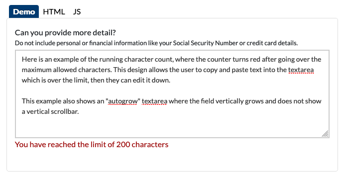 The design of the character component we used allows user input to exceed the maximum characters but applies an error class to the character count when the input exceeds the maximum allowed characters. This lets users type or copy and paste their full input, then edit it down. In addition to this message, frontend validation should be used to prevent form submission when the input exceeds the maximum allowed characters.