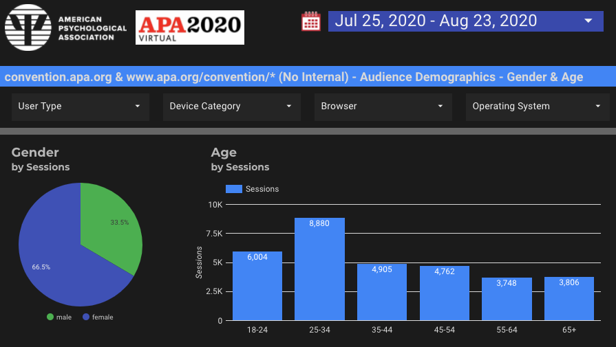 This new Data Studio dashboard has datasources from Google Analytics for the convention.apa.org site, as well as partial data from the Omnipress vendor.