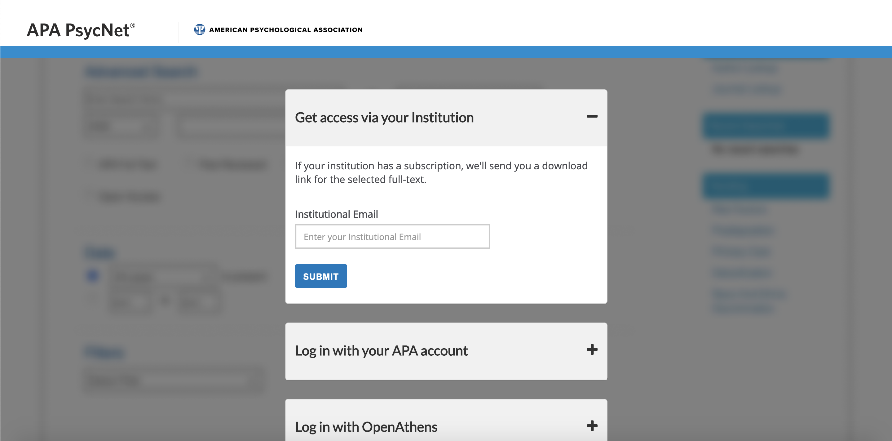 If the user is not logged in and clicks the download PDF button on their desired article, they will be prompted to check to see if they have access to APA PsycNet. From there, they see if they have an APA account, institutional subscription, or Open Athens account. Once they verify their account, they will be able to get the one-time PDF download.